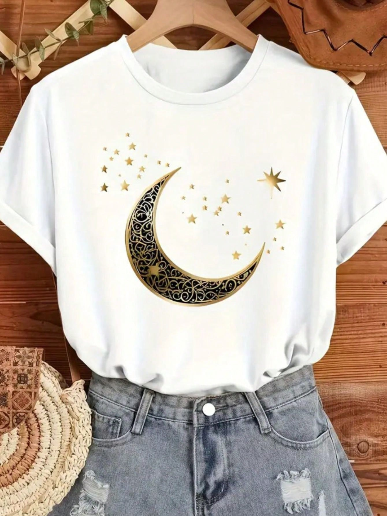 Encante-se com a Camiseta Feminina Lua & Estrelas – uma peça delicada e sofisticada que une modernidade e um toque celestial. Com estampa dourada detalhada, traz a lua crescente e estrelas em design artístico que transmite charme e elegância.